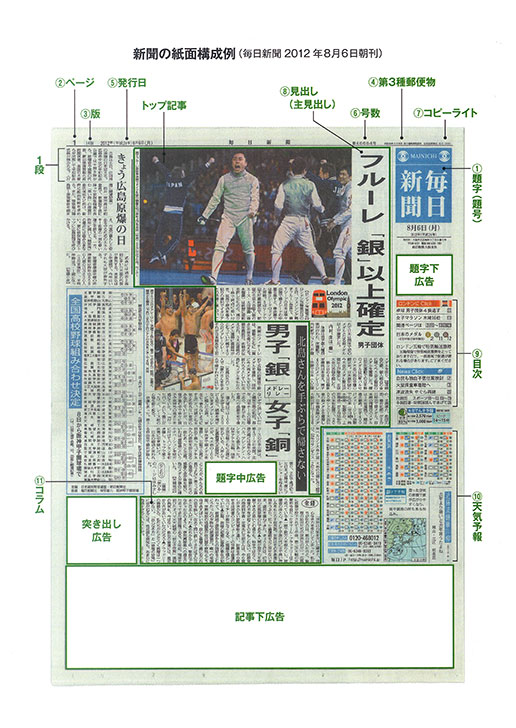 (1)題字(題号)(2)ページ(3)版(4)第3種郵便物(5)発行日(6)号数(7)コピーライト(8)見出し(主見出し)(9)目次(10)天気予報(11)コラム